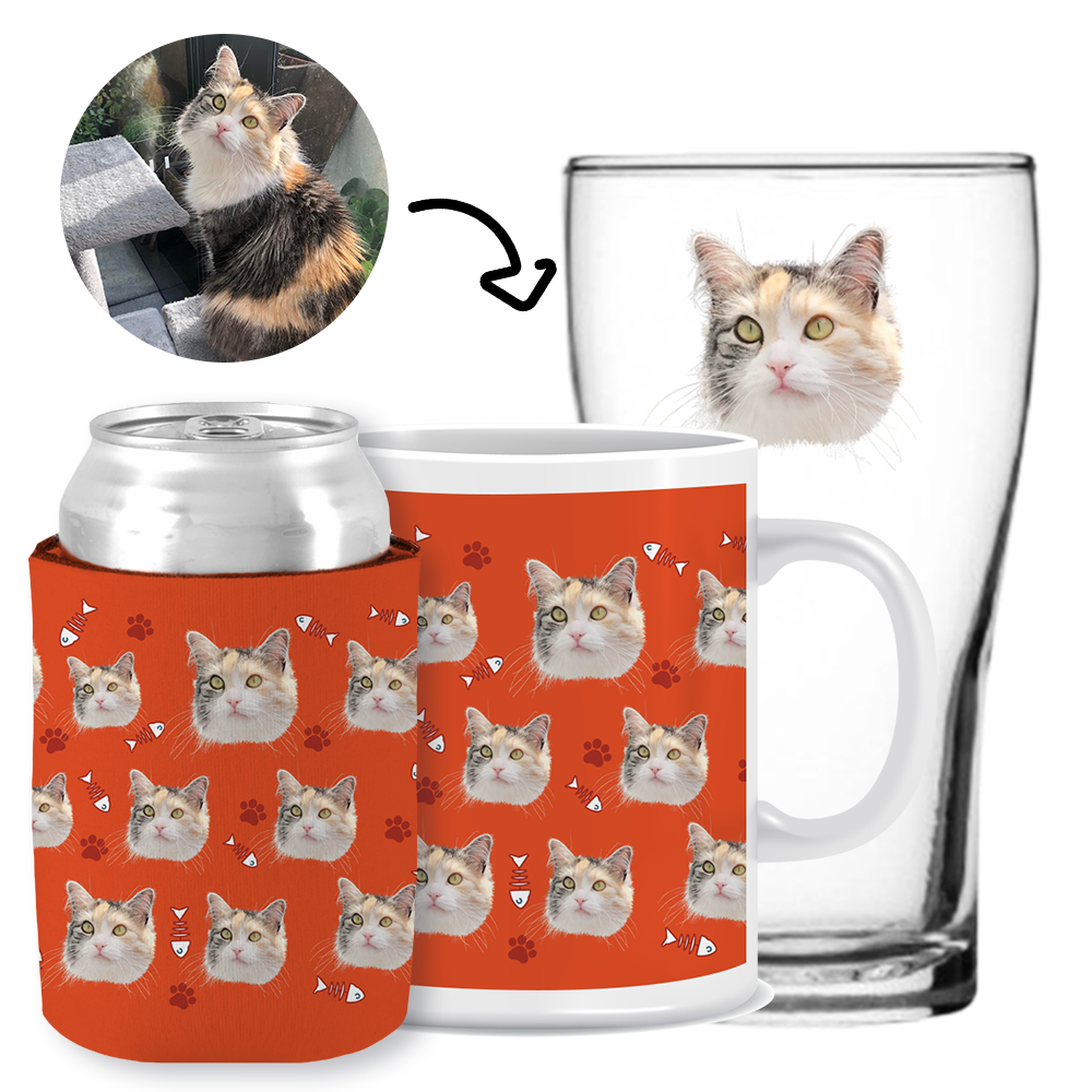 Your Pet Cat Face (Orange) - Kit 3 (Stubby Holder, Ceramic Mug & Schooner Glass)